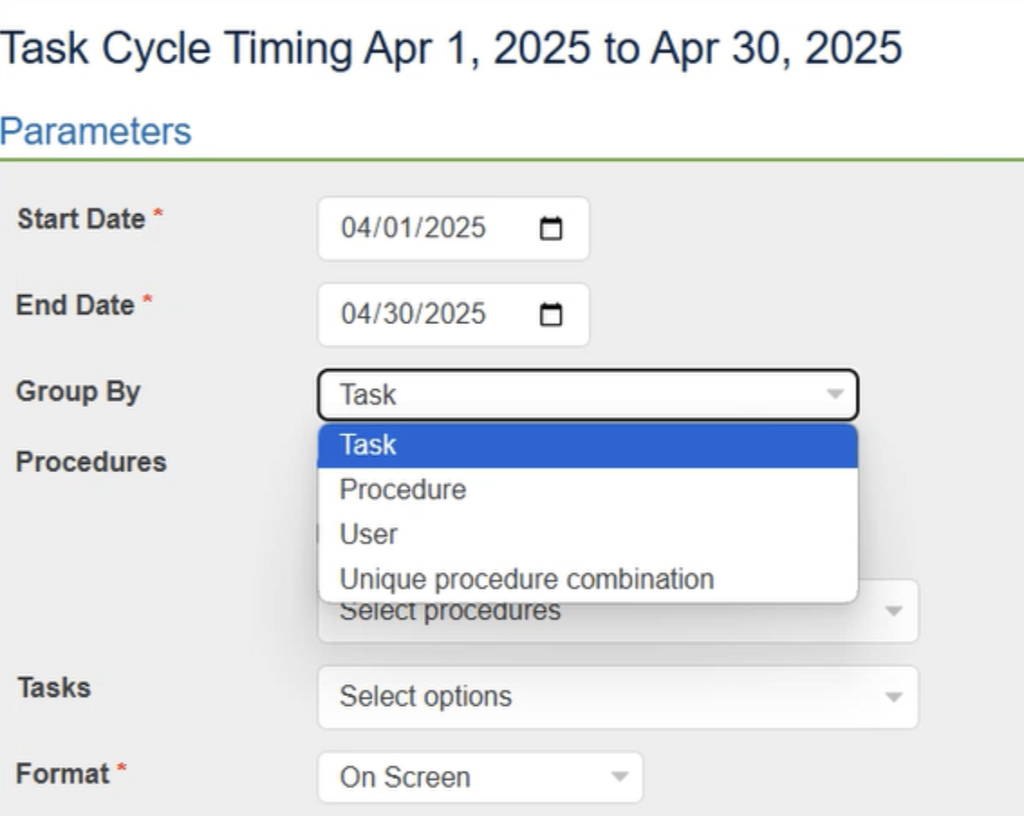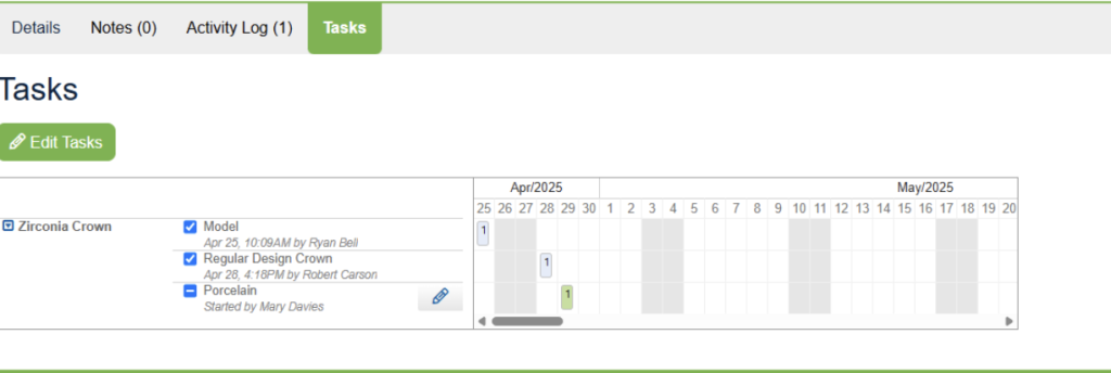 Task Timing allows a user to Start a task and stop a task and track the time it took to complete the task
